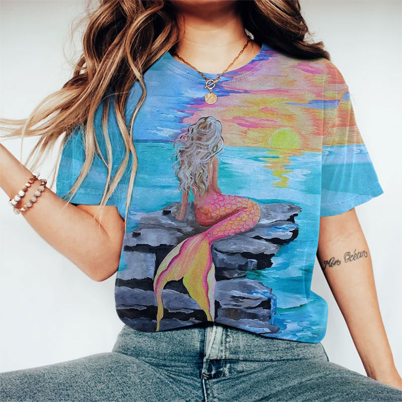 Dashingsoul Fantasy Sunset Mermaid Oil Painting Art Print Short-sleeved T-shirt