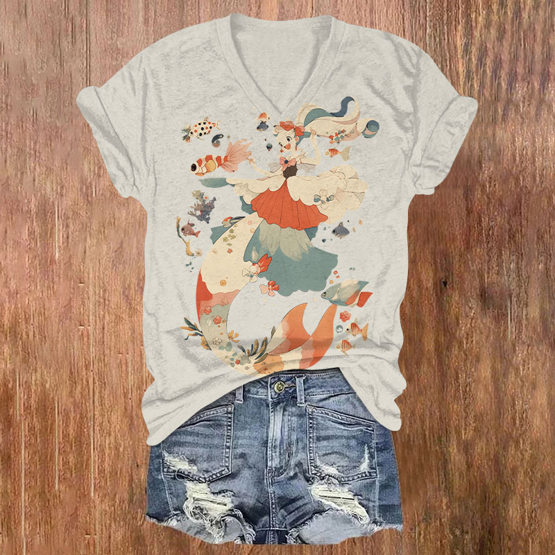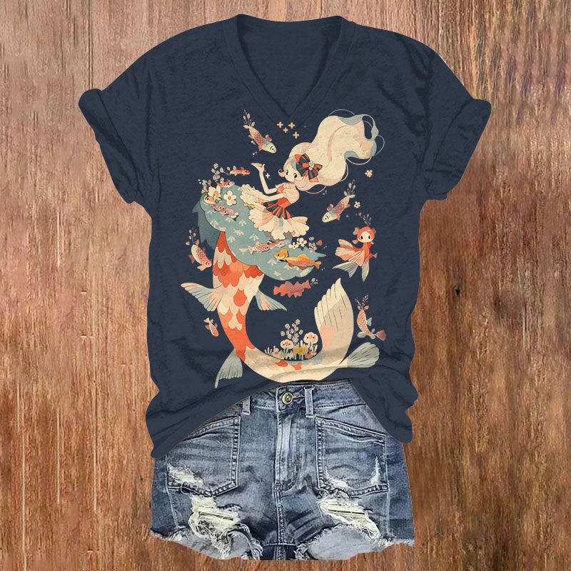 Dashingsoul Japanese Beautiful Mermaid And Fish Print V-neck T-shirt