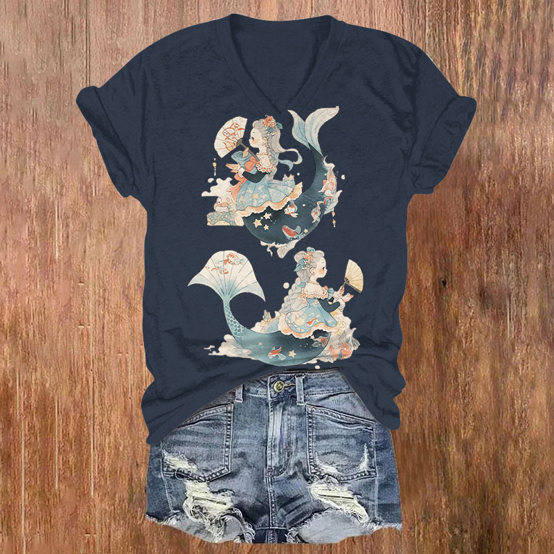 Dashingsoul Japanese Underwater World Mermaid Print V-neck T-shirt
