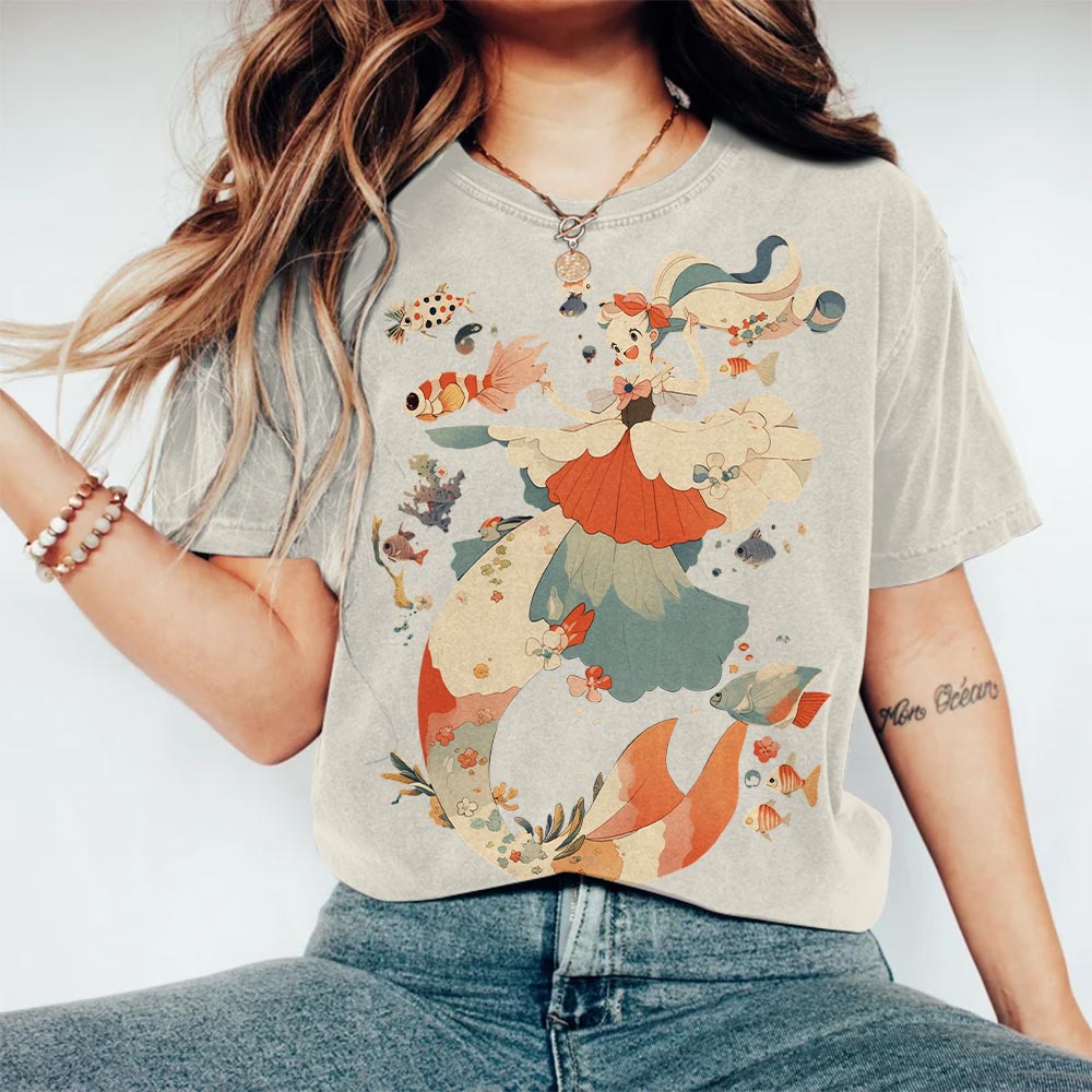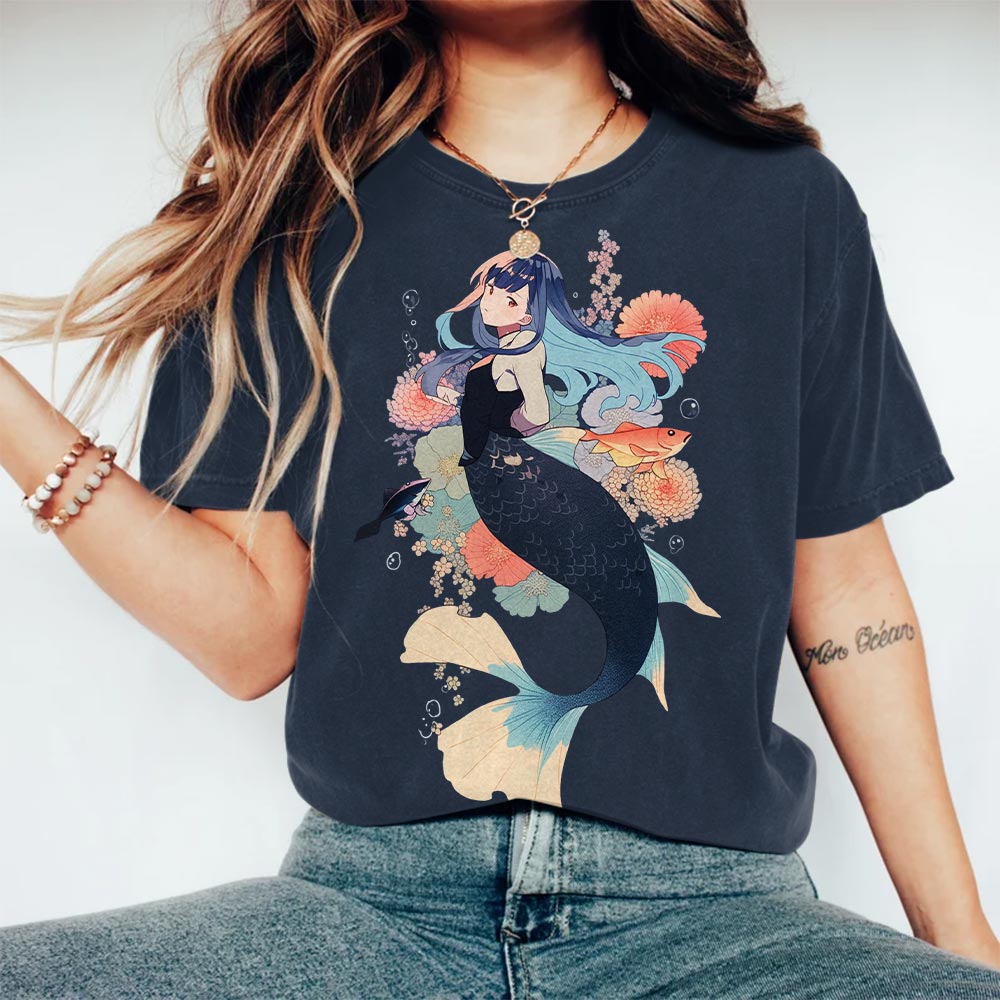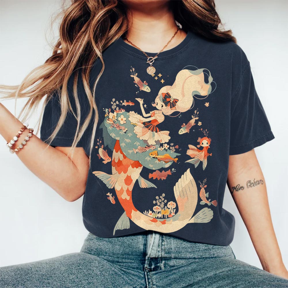 Dashingsoul Japanese Beautiful Mermaid And Fish Round Neck T-shirt