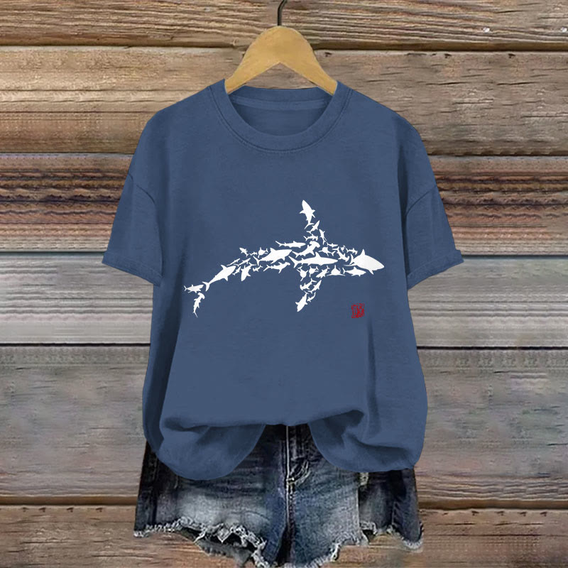 Dashingsoul Shark Swimming Among Sardines Print T-shirt