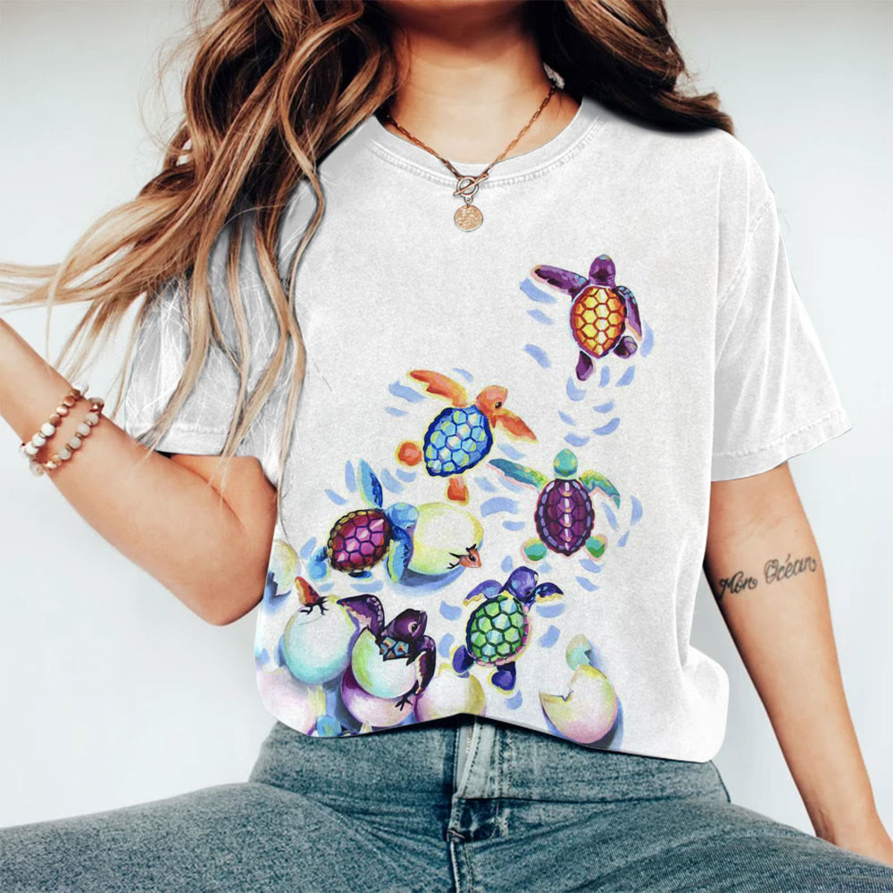 Dashingsoul Baby Sea Turtles Beach Fiber Art Print Casual Short Sleeve Blouse