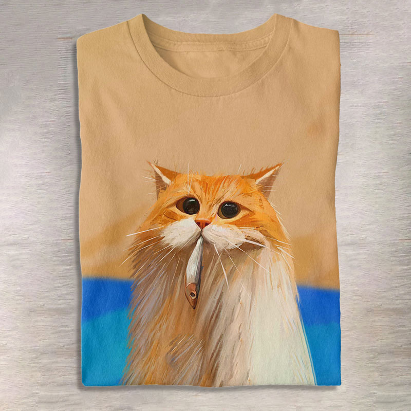 Dashingsoul Cute Eating Dried Fish Cat Print T-shirt