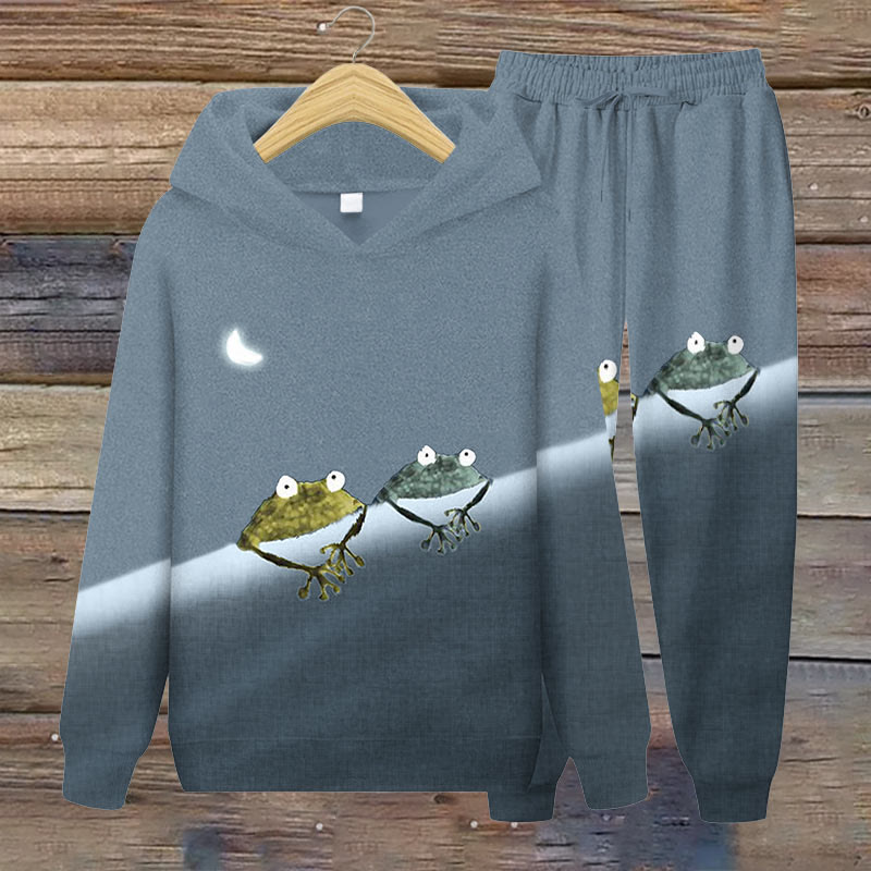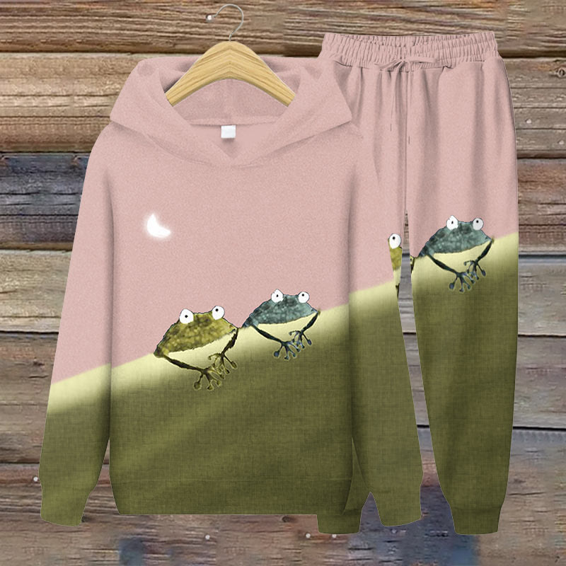 Dashingsoul Simple Frog Color Block Print Casual Hoodie Set