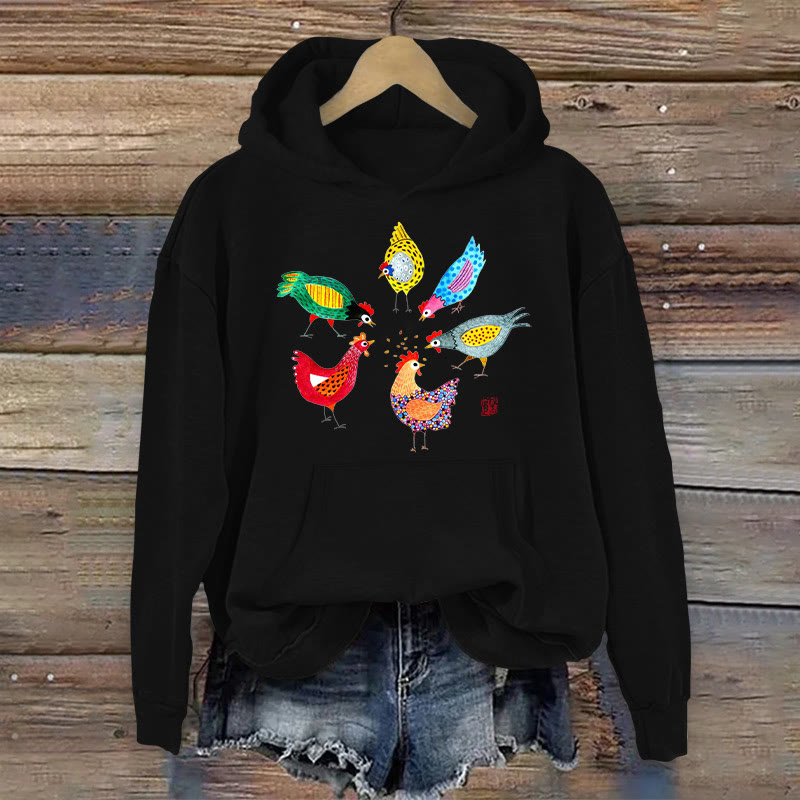 100% Cotton Watercolor Chicken Print Women's Hoodie - Black - 2XL - image 7