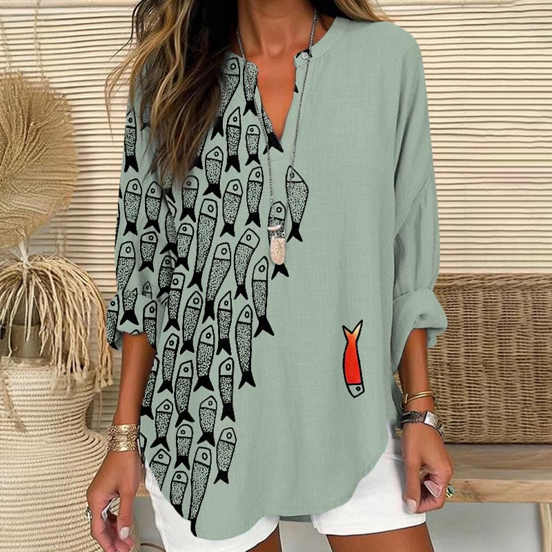Dashingsoul Cute Simple Lines Abstract Geometric Fish Art Print V Neck Long Sleeve Blouse
