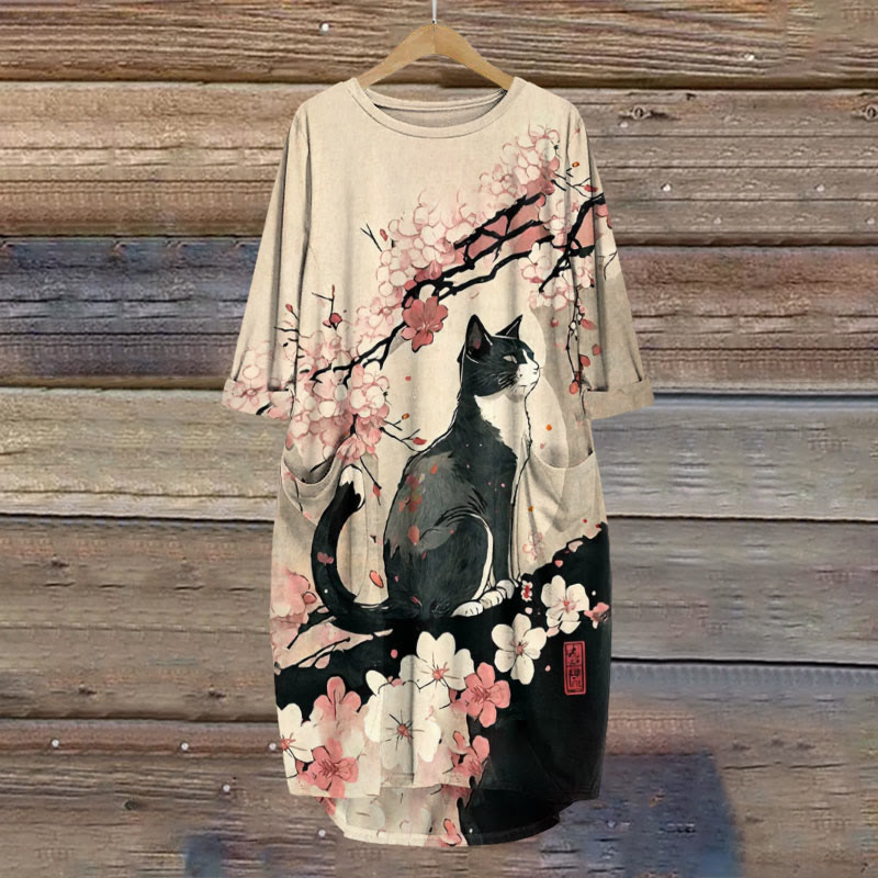 Dashingsoul Japanese Art Style Floral Cat Print Crew Neck Casual Dress
