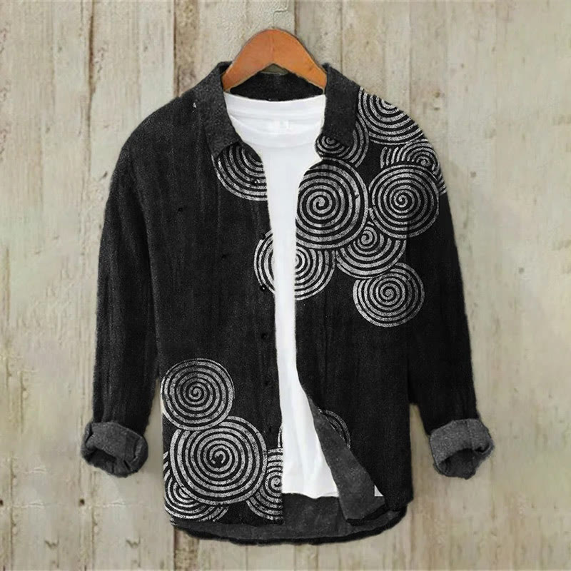 Men's Sea Waves Ripples Japanese Lino Art Print Casual Long Sleeve Lapel Shirt