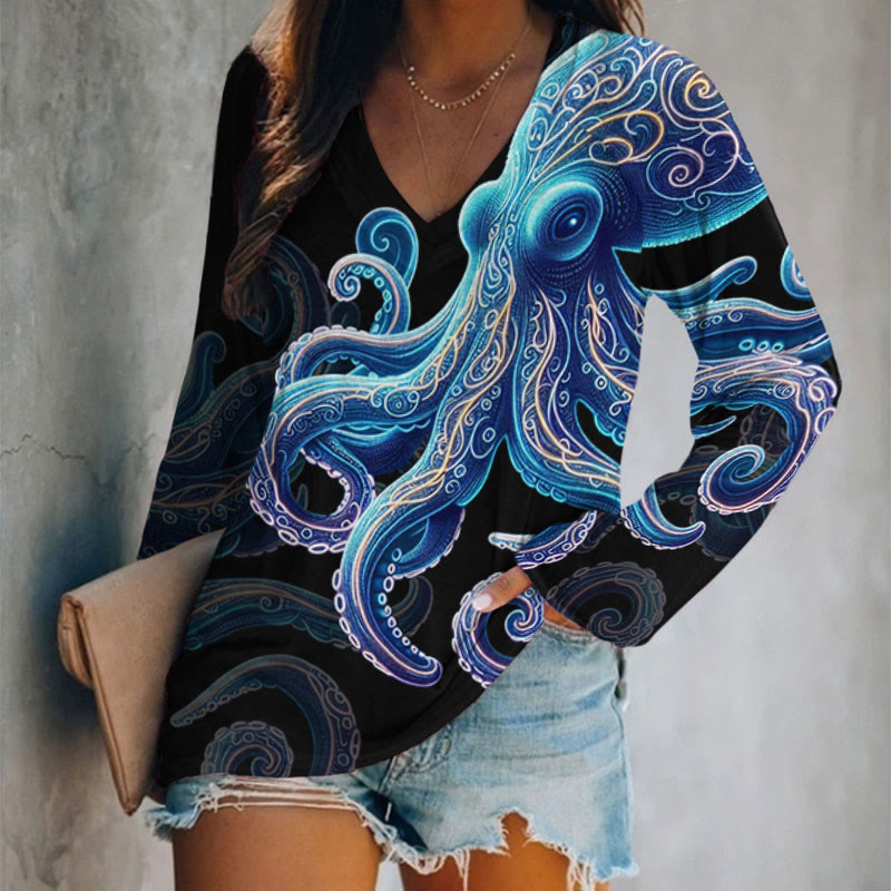Vintage Wise Ocean Octopus Print Long Sleeve T-shirt