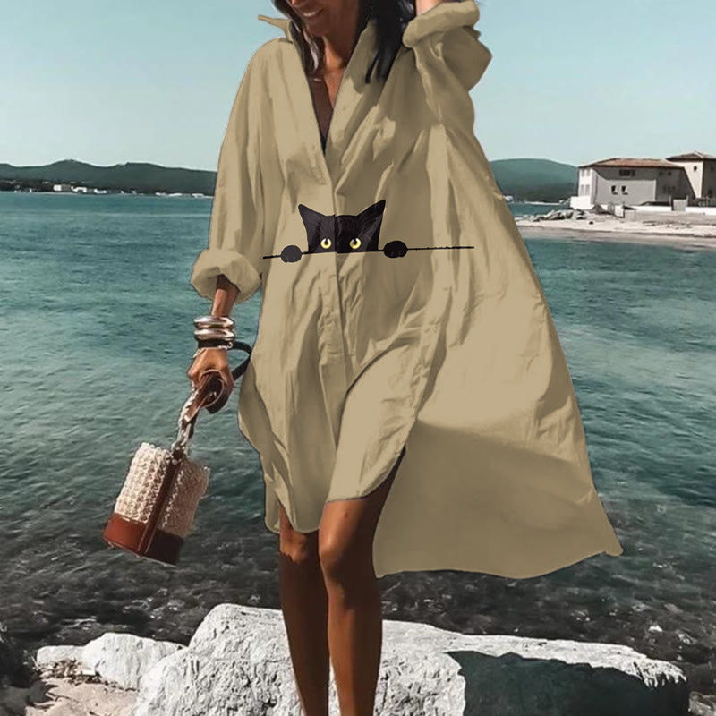 Dashingsoul Women's Funny Peeping Little Cat Vacation Vintage Print Shirt Dress