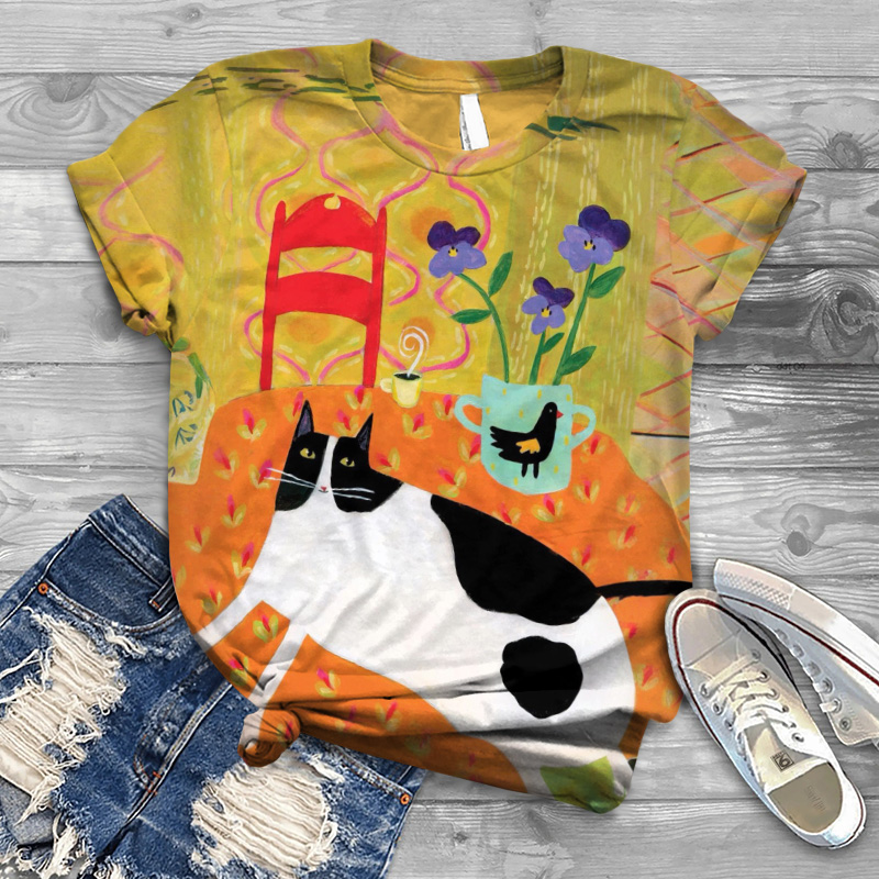 Dashingsoul Funny Abstract Lazy Cow Cat Oil Painting Art Print Short Sleeve T-shirt