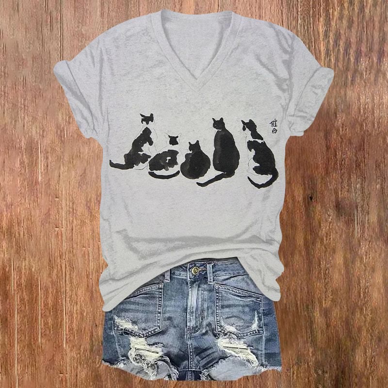 Dashingsoul A Group Of Ink Cow Cats Print V-neck T-shirt