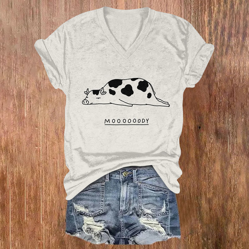 Dashingsoul Women's Moooooody Lazy Milk Cow Print Casual V-neck T-shirt