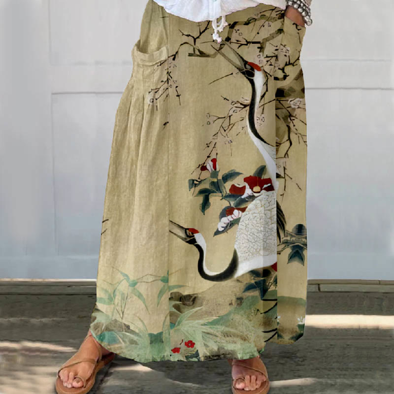 Dashingsoul Women's Oil Painting Chirping Crane Floral Print Casual Pocket Skirt