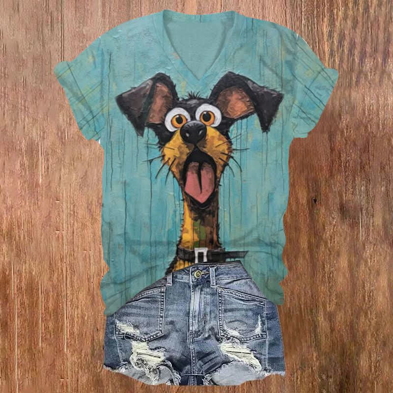 Dashingsoul Funny Silly Dog Art Print V-neck T-shirt