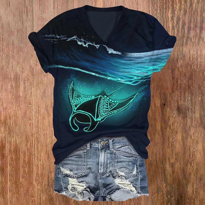 Dashingsoul Watercolor Flowers Manta Ray Print V-neck T-shirt