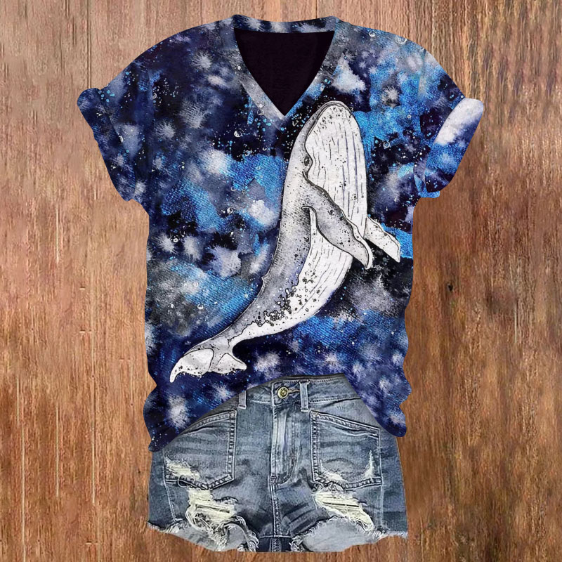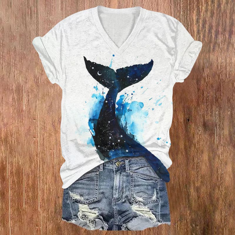 Dashingsoul Watercolor Whale Tail Print V-neck Short Sleeves T-shirt