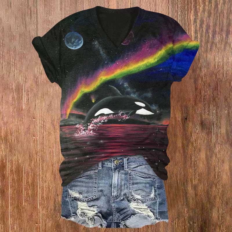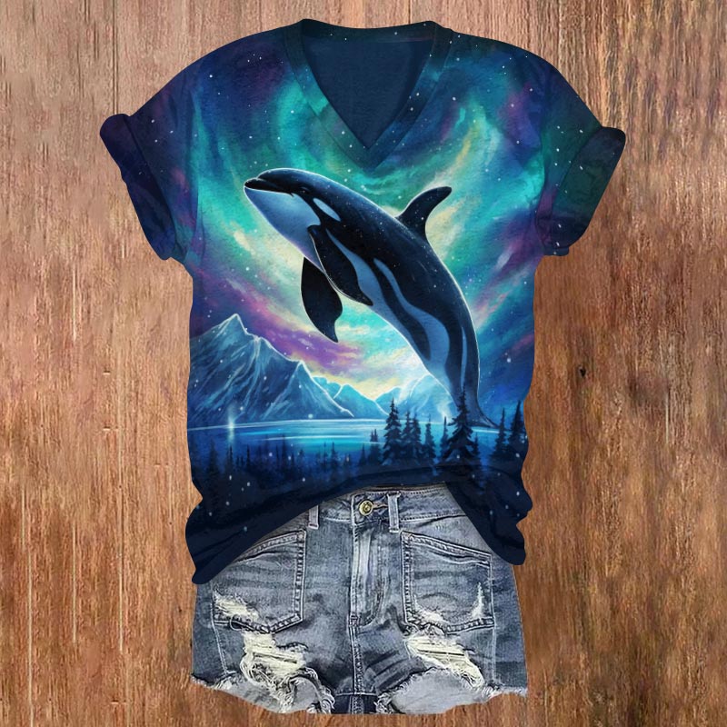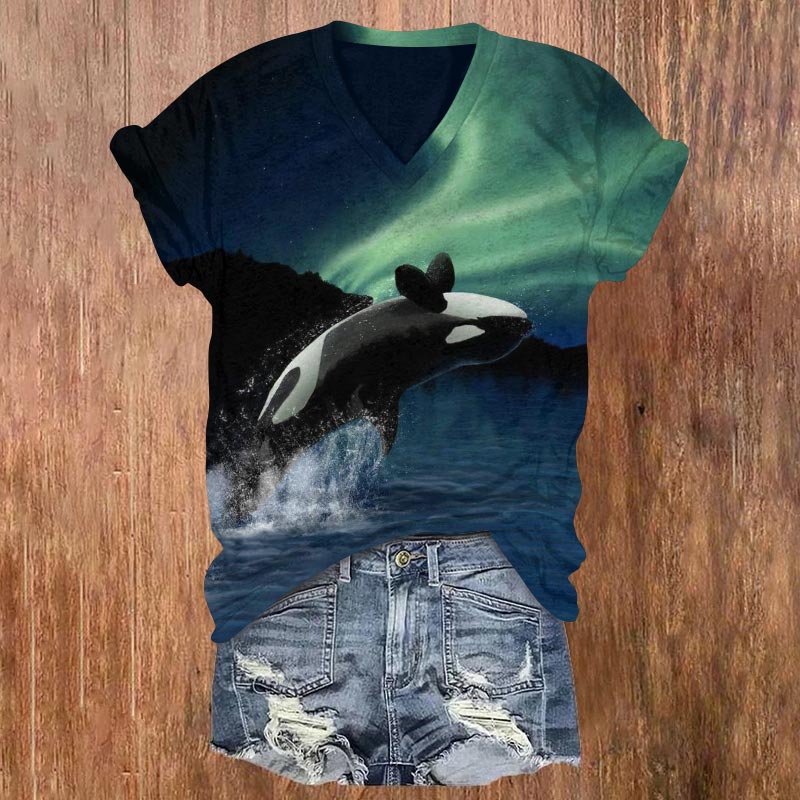 Dashingsoul The Orca Leaps Into The Gorgeous Aurora Print V-neck T-shirt