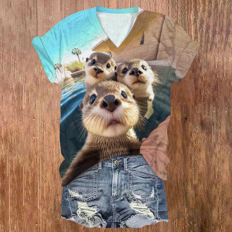 Dashingsoul Adorable Sea Otter Selfie Print V-neck T-shirt