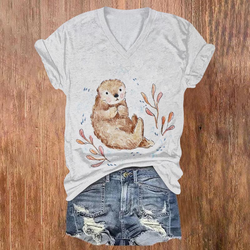 Dashingsoul Cute Shy Sea Otter Cartoon Print V-neck T-shirt