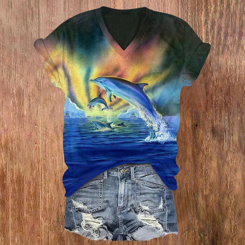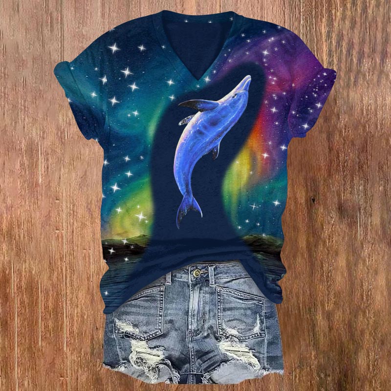 Dashingsoul Fantasy Aurora Dolphin Print V-neck T-shirt