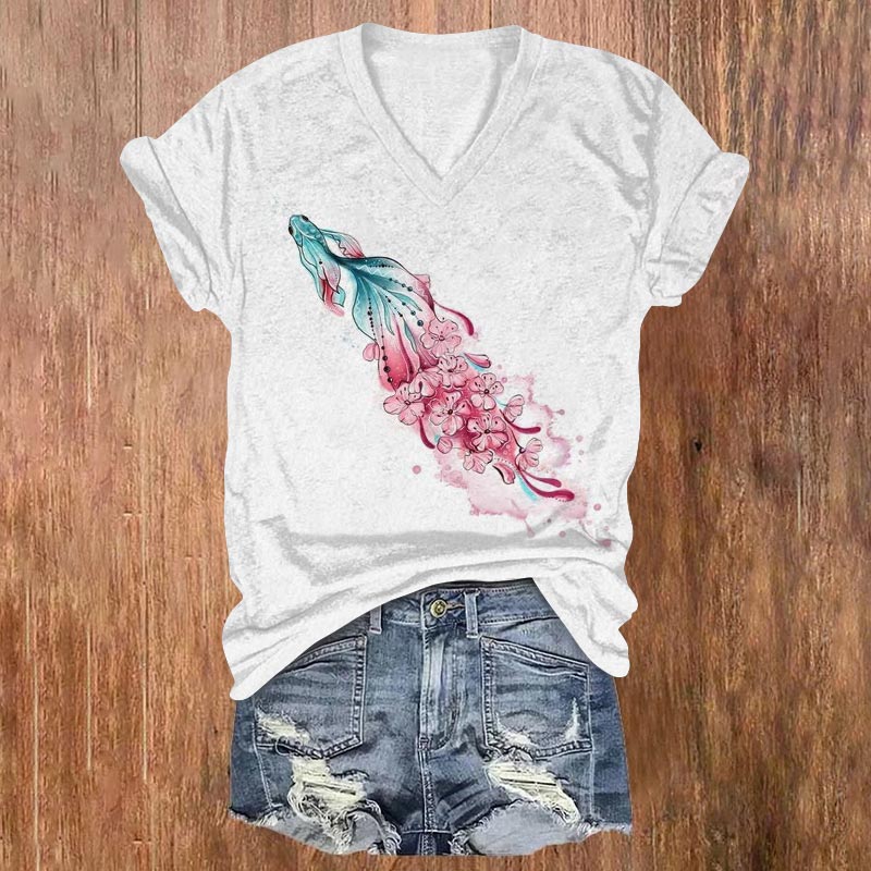 Dashingsoul Watercolor Goldfish Flower Print V-neck T-shirt