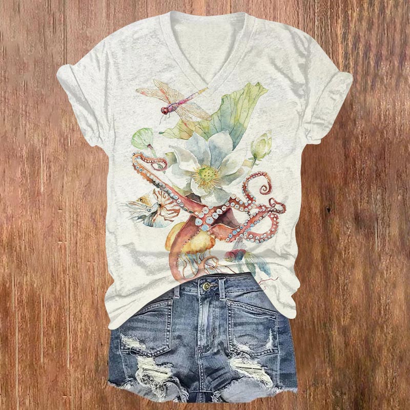 Dashingsoul Fantasy Octopus Flowers Watercolor Print V-neck T-shirt