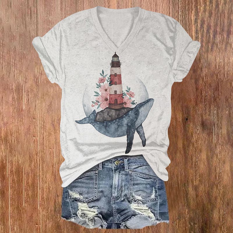 Dashingsoul Fantasy Whale Flower Lighthouse Print V-neck T-shirt