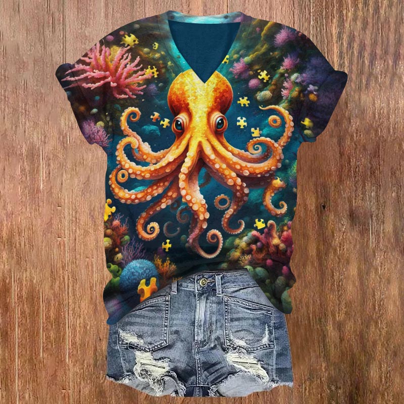 Dashingsoul Colorful Puzzle Octopus Print V-neck T-shirt