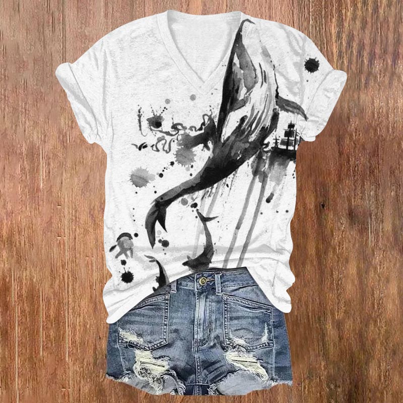 Dashingsoul Ink Whale Print V-neck T-shirt