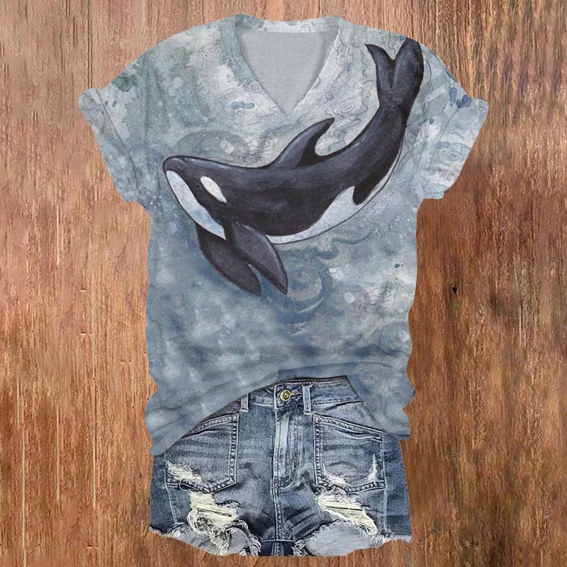 Dashingsoul Watercolor Killer Whales Print V-neck T-shirt