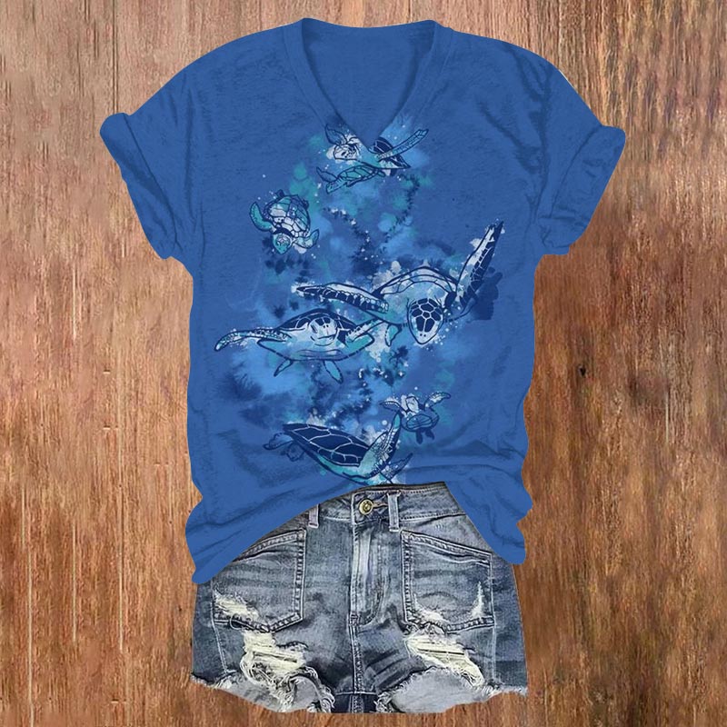 Dashingsoul Swimming Turtles Print V-neck Short Sleeves T-shirt