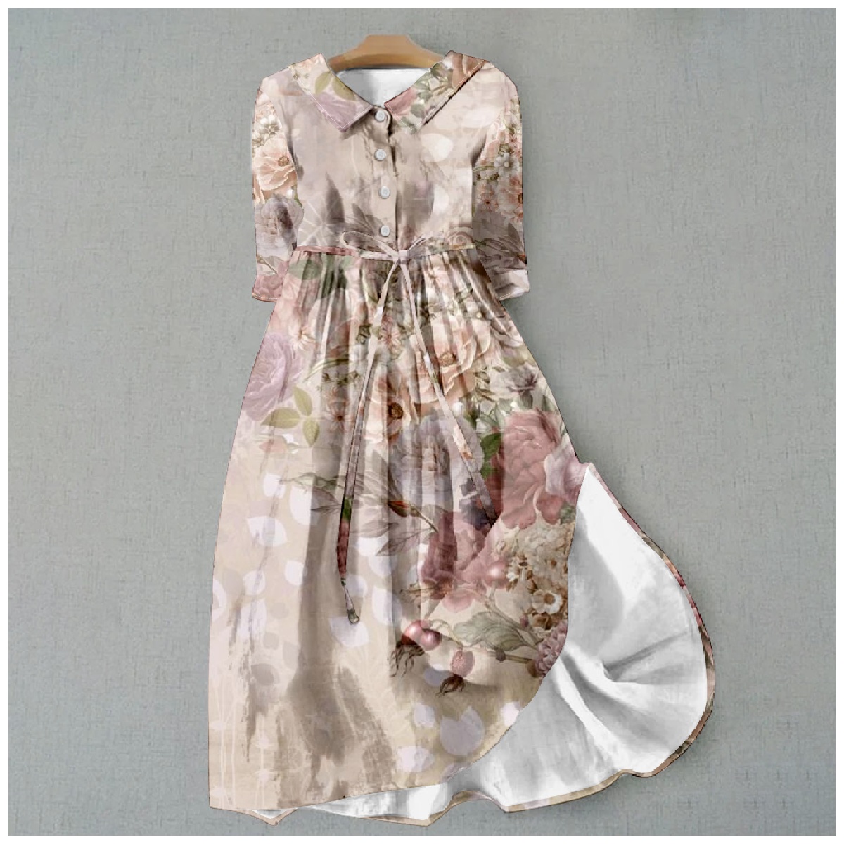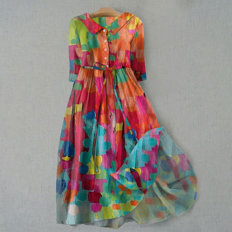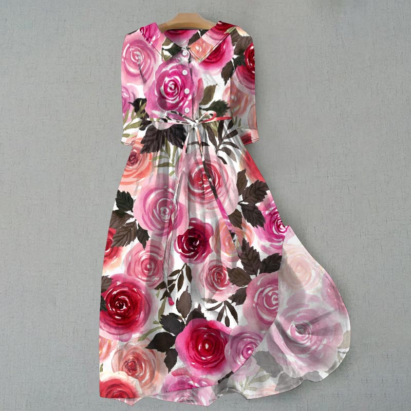 Dashingsoul Women's Artist Abstract Rose Print Waist Tie-up Lapel Dress