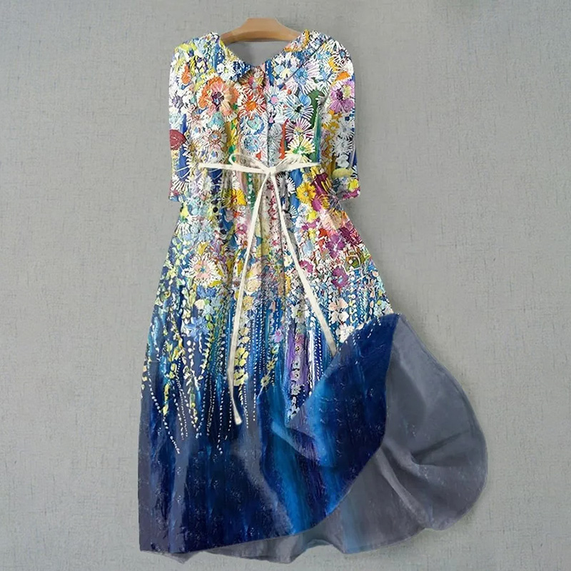 Dashingsoul Women's Literary Pastoral Wildflower Art Print Tie Loose Dress