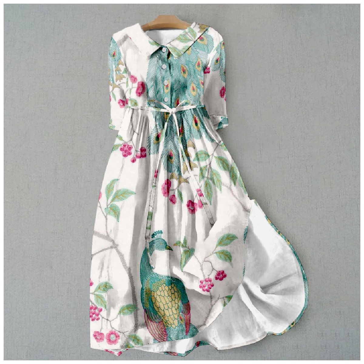 Retro Literary Floral Peacock Art Print Waist Tie-up Lapel Dress