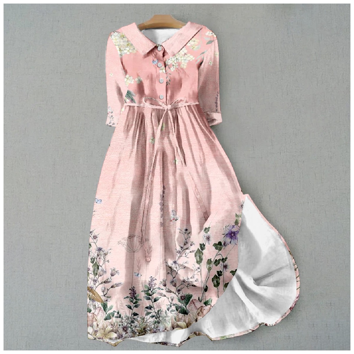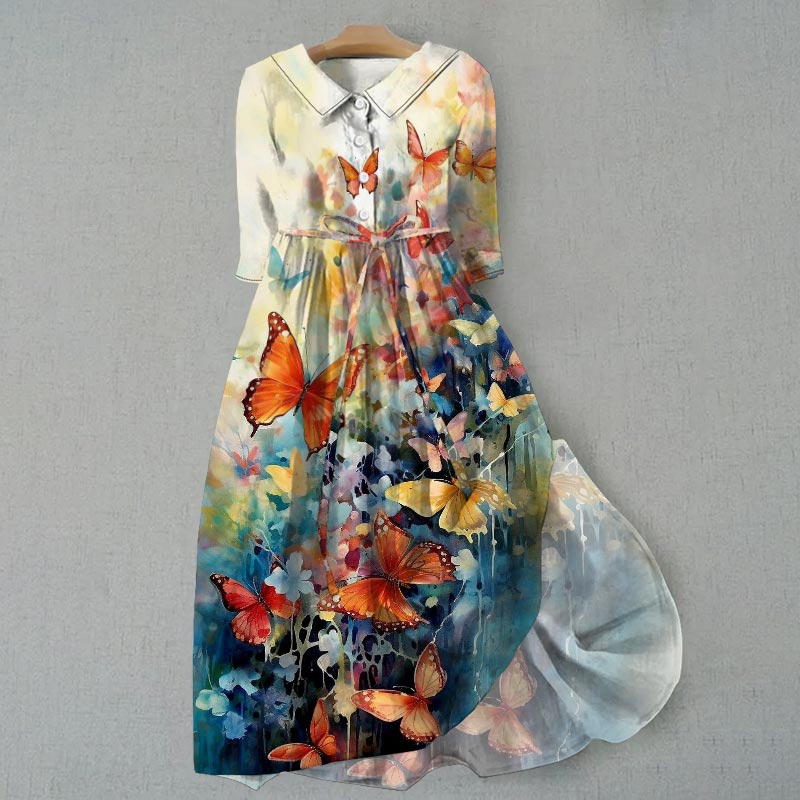 Dashingsoul Women's Elegant Retro Colorful Floral Butterfly Print Waist Tie-up Lapel Dress