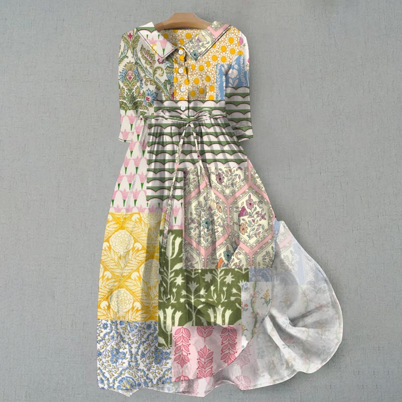 Bohemian Vacation Artistic Floral Patchwork Print Waist Tie-up Lapel Dress