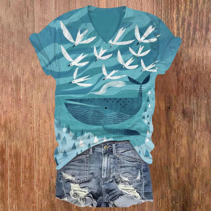 Dashingsoul Geometric Whale And Bird Art Print V-neck T-shirt