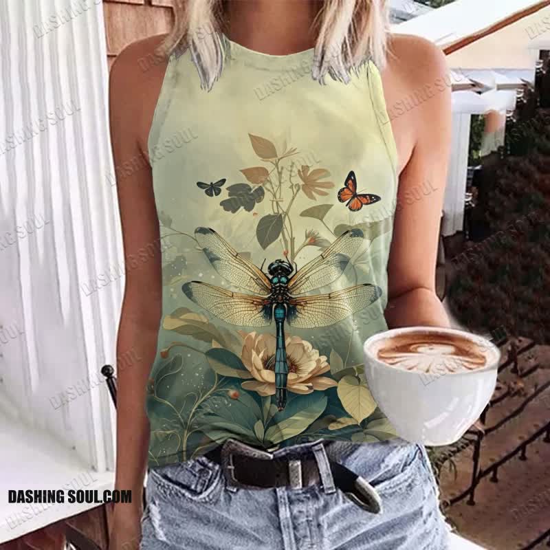 Mystical Dragonfly Butterfly & Flowers Art Print Crew Neck Tank Top