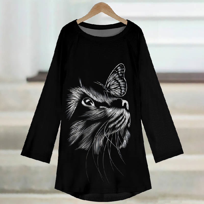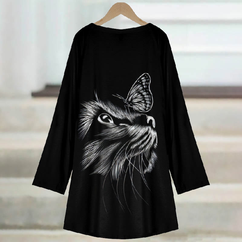 Dashingsoul Women's Ink Watercolor Cat And Butterfly Print Casual Long Sleeve Tunic