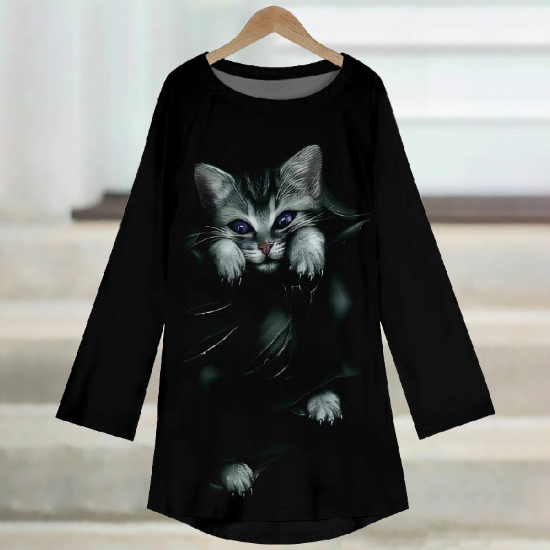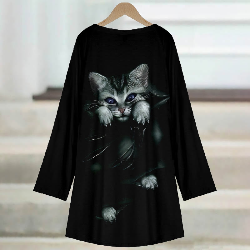 Dashingsoul Women's Japanese Vintage Cute Lazy Cat Print Casual Long Sleeve Tunic