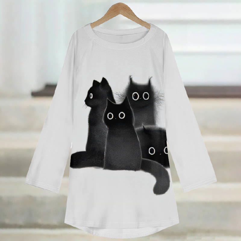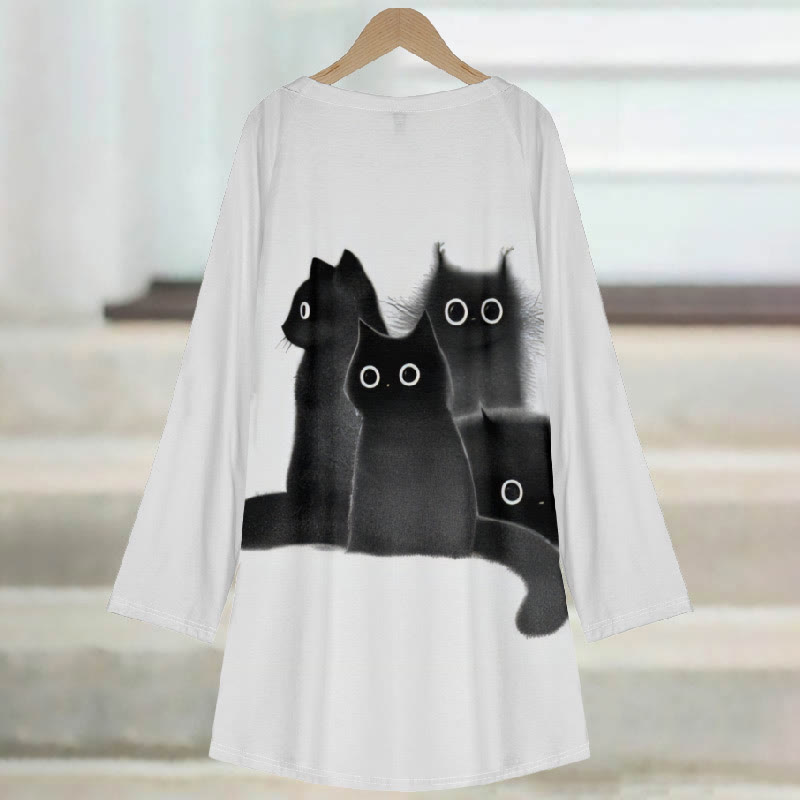 Dashingsoul Women's Lovely Dazed Cartoon Black Cat Print Casual Long Sleeve Tunic